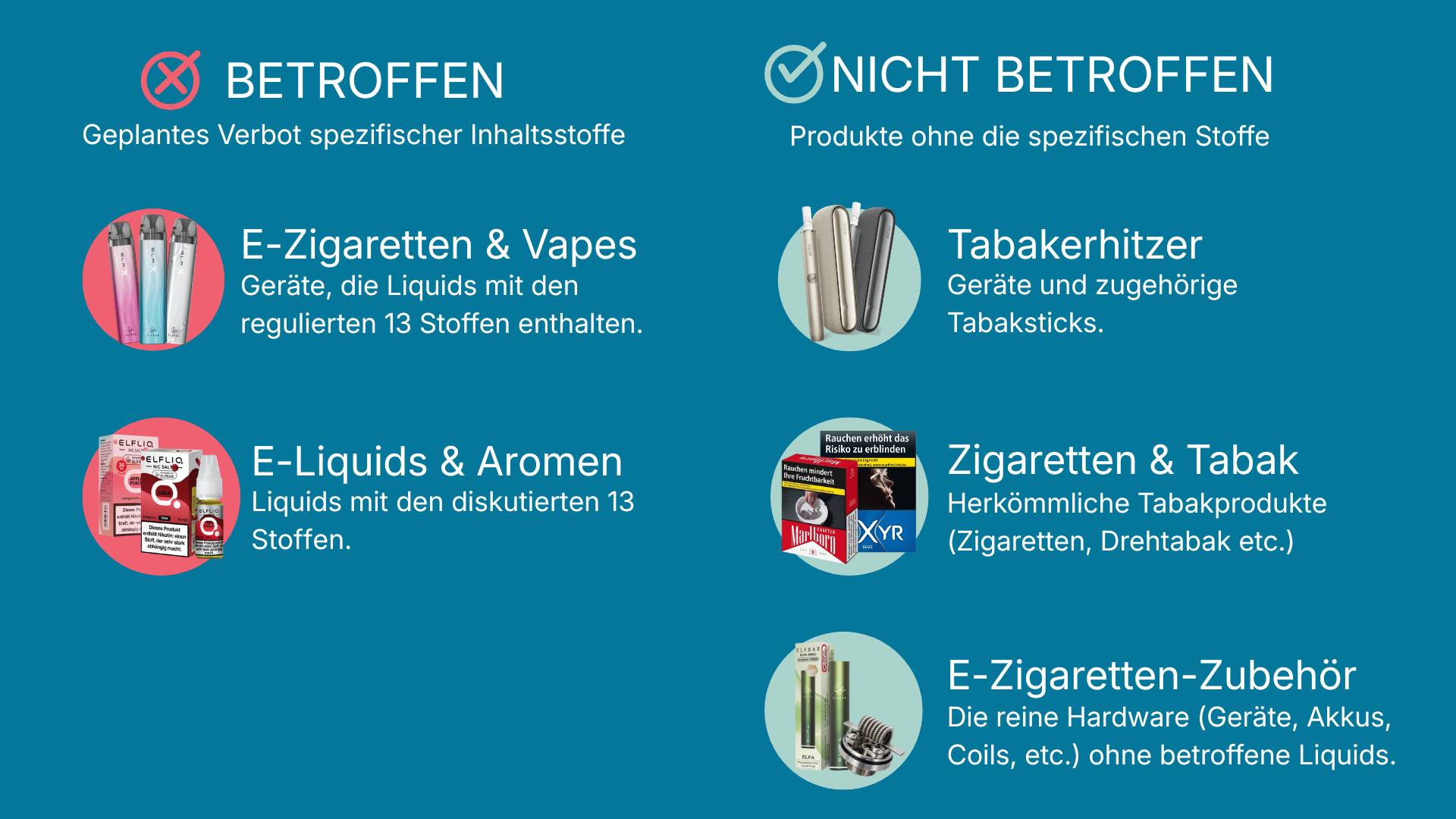 Das geplante Verbot betrifft alle E-Zigaretten und Nachfüllbehälter, die einen oder mehrere der 13 aufgelisteten Stoffe enthalten. In der Praxis heißt das: Ein Großteil der aktuell auf dem Markt verfügbaren Liquids wäre betroffen. Menthol ist als Einzelstoff oder Bestandteil von Kühlkomponenten in geschätzt 80 % aller Liquid-Rezepturen enthalten.