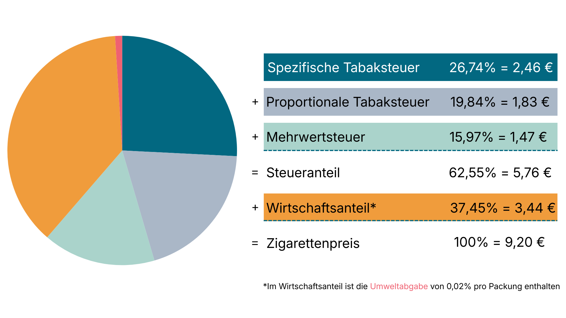 - Proportionale Tabaksteuer: 19,84 % des Kleinverkaufspreises.